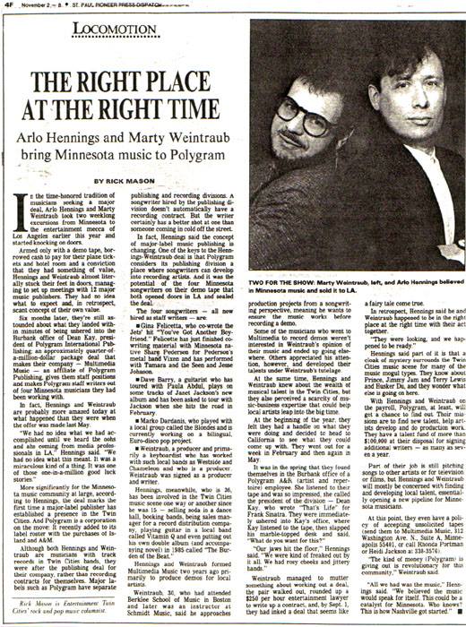 As documented in the St, Paul Pioneer Press feature story, The Right Place at the Right Time, Weintraub and Hennings were now legal 50/50 partners (Arlo Hennings Publishing Co.) in a publishing/production contract with PolyGram Music International, (Universal Music Group).